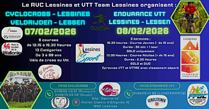 Affiche organisateurs. Les 07 et 08 février 2026, LESSINES sera "CYCLISTE". En effet, le "ROYAL VELO CLUB SAINT-ROCH" et le "VTT TEAM LESSINES" unissent leurs forces pour organiser la seconde édition du week-end qui ouvre la saison de l'entité. Pour toutes les informations utiles, voyez l'affiche et visitez la page FB des deux clubs. Concernant … Lire la suite CYCLO-CROSS ET ENDURANCE VTT. LESSINES. 07-08/02. INFOS BRÈVES.🥏2026