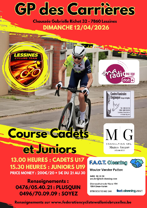 Affiche organisateur. Le nouveau club créé à LESSINES - cette année - sous l'appellation : "LESSINES CYCLING TEAM" a repris la date du 12 avril 2026 à son actif. Des épreuves réservées aux DEBUTANTS et aux JUNIORS auront toujours lieu dans le quartier Saint-Roch. La continuité est assurée. Beaucoup de changements en vue. Le rassemblement … Lire la suite LESSINES – DEB/JUN – 12/04. INFOS.🥏2026