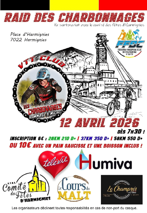 Affiche organisateur. Le club "LES CHARBONNAGES" n'est plus à présenter. Les membres sont régulièrement en contact avec ceux du "VTT TEAM LESSINES". Ils étaient d'ailleurs en nombre à Lessines en février - endurance. Une bande de joyeux drilles qui est active toute l'année dans les chemins. Top !!! Dimanche, le 12 avril, le club vous … Lire la suite HARMIGNIES – « LES CHARBONNAGES » – VTT. TELEVIE. 12/04. INFOS.🥏2026