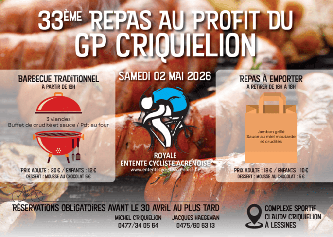 Affiche organisateur qui nous a été transmise par Mr Jacques HAEGEMAN. Merci. "LA ROYALE ENTENTE CYCLISTE ACRENOISE" organise son traditionnel BARBECUE + REPAS A EMPORTER en date du 02 mai 2026. Il est réalisé au profit du "GP CRIQUIELION". Sur place BARBECUE dès 19.00. A emporter JAMBON GRILLÉ entre 16.00 et 18.00. Prix variables. Lieu … Lire la suite BARBECUE + A EMPORTER DE LA « ROYALE ENTENTE CYCLISTE ACRENOISE ». INFOS. 02/05.🥏2026