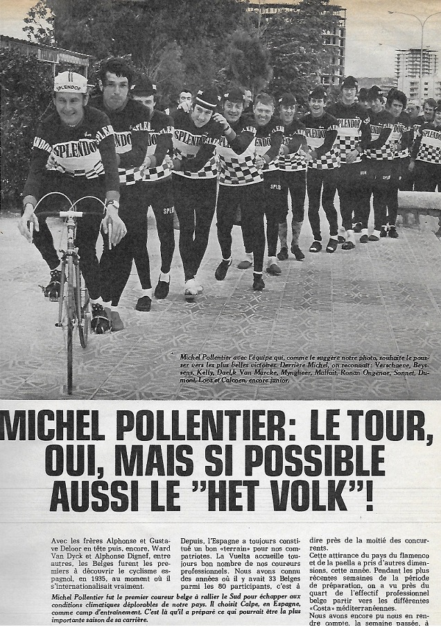Pourquoi évoquer Michel POLLENTIER en ce moment ? Tout simplement car il est encore énormément dans l’actualité cycliste. Alors qu’il tient une centrale du pneu à Nieuwpoort, il a également gardé des racines dans le vélo en étant DS de la très belle structure EFC-LR-VULSTEKE dans laquelle évoluera cette année Julien VANDENBRANDE. (anc VERANCLASSIC) Et puis, il a fait l’objet d’un très beau reportage il n’y a pas très longtemps en Flandre. Espérons qu’il puisse être diffusé sur nos chaînes francophones. Par ailleurs, son équipe était aussi en représentation à VELOFOLLIES ce samedi. Quand on vous dit qu’il est toujours bien là à 65 ans. Mais Michel POLLENTIER, souvenons-nous qu’il a été un brillant coureur cycliste. De 1973 à 1984, il a été dans les équipes FLANDRIA, SPLENDOR, VERMEER et SAFIR. Il a côtoyé Claudy CRIQUIELION en 1980, (SPLENDOR) de même que des MALFAIT, KELLY, DEMEYER, AGOSTINHO, DENUL, HEIRWEG, VERMEIRE, VAN HOOLEN, GODFROOT, MAERTENS, SONNET, ONGHENA, VAN CALSTER et bien d’autres. Il a gagné plus de cent courses. Dont une à Templeuve et une autre à Momignies. Il a aussi remporté le Tour des Flandres, le Tour de Belgique, Une étape du Franco Belge, Le Tour d’Italie ainsi que le championnat de Belgique à deux reprises. C’était un habitué des trois grands tours. Sans compter qu’il a eu de fameux directeurs sportifs avec Fred DEBRUYNE, Albert DE KIMPE ou encore DE GRIBALDY et Brieck SCHOTTE. Comme nous le constatons, un bon coureur peut devenir un bon DS. Car de son team actuel, ils sont plusieurs à avoir franchi le pas du professionnalisme. Avec ce « SOUVENEZ-VOUS », nous sommes heureux de reparler de ce coureur qui a marqué toute une génération. Nous allons d’ailleurs encore suivre les pérégrinations de son team en 2017.