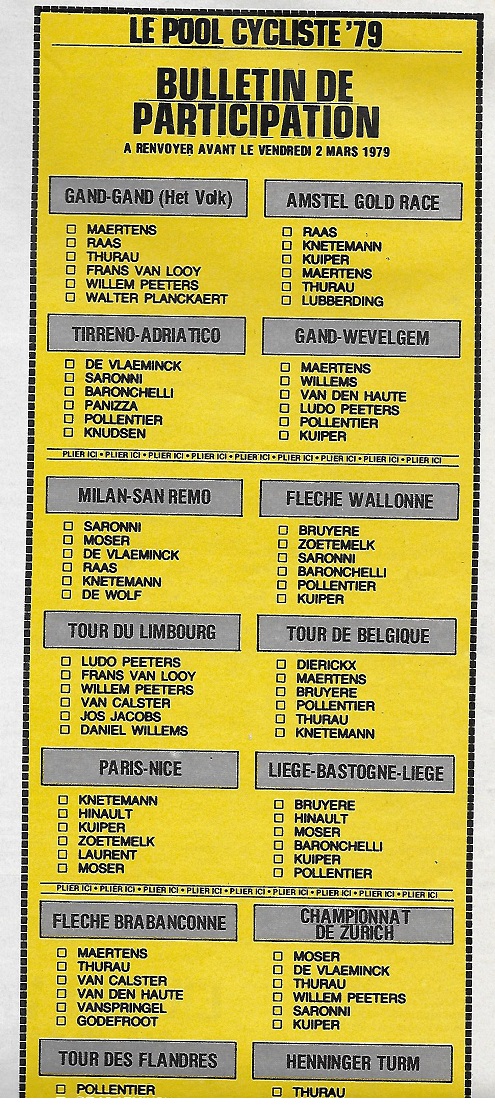 En 1979 et dans les années antérieures comme postérieures, il y avait régulièrement des pronos dans les magazines. Certains se souviendront même que chaque samedi, vous pouviez vous rendre au café « Chez Agnès » à Bois-de-Lessines pour y faire votre pronostic. Quand vous souhaitiez faire une loterie, il suffisait de demander l’autorisation au Bourgmestre de votre commune. Il nous semble que les choses étaient bien plus faciles il y a trente ans que de nos jours. A force de tout réglementer, la liberté se réduit. (nous en voyons qui vont discuter le sujet) Bien qu’il faut admettre que les malversations sont moins nombreuses. En Flandre, par exemple, vous avez toujours les bookmakers sur les courses. C’est autorisé par une loi communautaire. Concernant les pronos, à notre sens, ils sont régis par la Commission des jeux de hasard créée en 1999 et présidée par un Magistrat et composée de membres de six ministères. Les casinos/jeux en dépendent. Souvenez-vous également de toute la problématique de l’équipe UNIBET.com qui a vécu en continentale de 2006 à 2007 et qui a terminé son contrat avec des coureurs porteurs de maillots blancs. (sans marque) La raison évoquée avait été de dire qu’il était interdit de faire de la pub pour des paris en ligne. C’est dire si depuis quelques années, tout est hyper cadenassé. Nous ne parlions pas de tout ça dans les années 1970. Tout était bon enfant, moins technocratique. Bien entendu, il pouvait y avoir des dérives. Mais quand vous voyez ce PRONO de 1979, il ne fallait tout de même pas vous attendre à gagner des millions sur une participation. Profitons encore un peu de ce document d’époque qui nous rappelle les noms des vedettes comme : MAERTENS, RAAS, THURAU, KUIPER, POLLENTIER, PEETERS, BRUYERES, VANCALSTER, … . C’était quelque chose !!! Et la mondialisation n’avait pas encore fait les ravages d’aujourd’hui. Celui-ci nous remémore aussi que nous entrons illico dans les courses du début de saison.