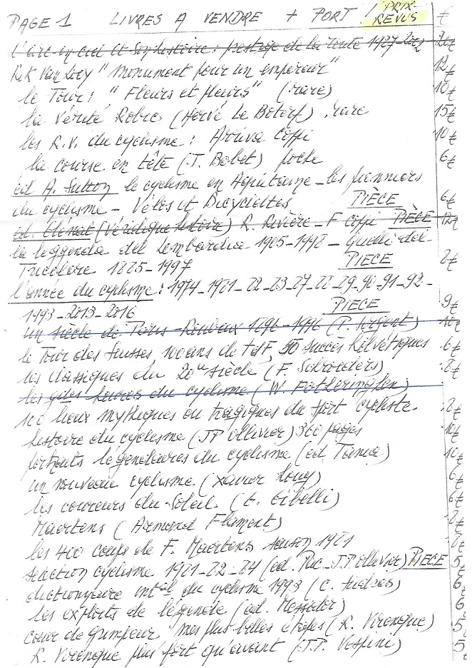 Vous vous souvenez très certainement des parutions de « COUPS DE PEDALES ». Cette publication a tenu le haut du pavé des années durant. Aujourd’hui, elle est toujours disponible sur le net mais il faut s’abonner également à « Mémoire du Cyclisme », site français qui lui sert de support technique. Mr CRASSET a repris la brochure à son compte. Si nous vous parlons de cela, c’est que Mr DEGAUQUIER, l’initiateur de CDP et qui avait tout stoppé il y a quelques années, vend encore pas mal de livres. Ses livres. Et à des prix très intéressants. Nous en avons mis une page en entête. Regardez bien, il y a de la bonne lecture pour vos petits moments de détente hivernaux.