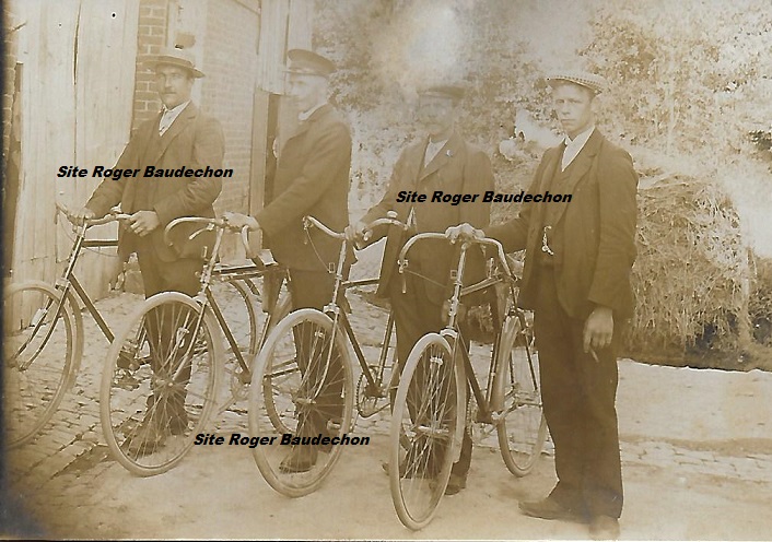 Une boîte métallique au fond d’un grenier réserve quelques fois des surprises bien agréables. Celle-ci contient des photos d’avant 1914. Des souvenirs, des traces du passé, d’un lointain passé. Plus de 100 ans, vous pouvez imaginer ? Une de ces images, a tout de suite attiré notre attention. Faite en noir et blanc non contrastés, elle démontre à souhait que le développement n’avait pas encore atteint la magnificence du digital. Un rien jaunie, un rien floue, un rien usée aussi. Elle vous montre des cyclistes posant pour le photographe. Notre grand-père y est. Mais pas avec un vélo de course. Car sur cette photo, vous voyez deux vélos de compétition des débuts de la bicyclette. C’est dire la valeur qu’elle peut encore avoir. Vers 1900 et plus tard, jusqu’aux environs de 1940, les gens se faisaient prendre le portrait et se servaient de celui-ci pour l’envoyer sous forme de carte postale.