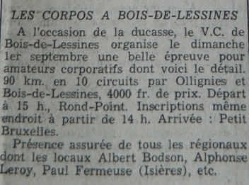 Début septembre, c’est la seconde ducasse du village de Bois-de-Lessines. L’autre a lieu en juin. Il restait, au moins, un point à éclaircir à propos du Vélo Club local. Avait-il organisé des courses pour non licenciés ? En effet, depuis sa création en 1951, il avait surtout mis sur pieds des épreuves LVB. (pas encore RLVB) Il faut dire qu’il avait de quoi faire avec les coureurs de la région : DELHAYE, DEGAUQUE, DEMEYER, PICOUX, VILAIN, SCORIER, … et le paternel. Deux courses étaient d’ailleurs programmées chaque année. Mais voilà, en ce mois de septembre 1964, le père a raccroché son vélo et manifestement le VC B-D-L a viré sa cuti. Regardez le texte ci-dessus. Il organise une « CORPO » (pour corporatifs ou non licenciés) en date du 1er septembre. C’est la preuve qu’il nous manquait.