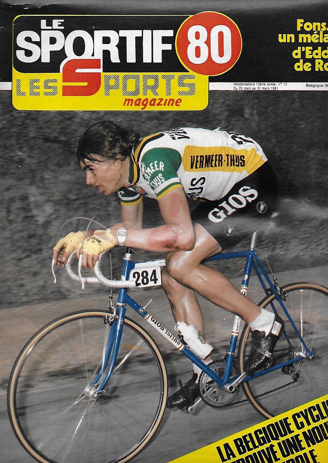 Pas la peine de faire durer le suspens. Vous avez reconnu Fons. Alfons DEWOLF. Le profil de jeune premier, grand , élancé, qui a mis le turbo de 1978 à 1990 dans les équipes suivantes : IJSBOERKE, BOULE D’OR, VERMEER, BIANCHI, EIUROP DECOR, FAGOR, SKALA, ADR et TULIP. Le grand Fons était un peu introverti mais il avait le goût du risque. Ce qui n’est pas contradictoire. Un fonceur. Il aura remporté 83 victoires sur sa carrière. S’il avait la classe, son aura était un peu surfaite. Les journalistes aiment bien faire des vedettes avec des jeunes pousses. L’anversois qui a maintenant 61 ans est peu présent dans le cycliste actuel pourtant, il a remporté des épreuves mythiques comme : des étapes de la Vuelta- au Giro, la Druivenkoers, il a même fait un top 10 au tour de France. Et même s’il a remporté un Het Volk, il reste avec des secondes places à Gand Wevelgem ou 3eme place à Liège Bastogne Liège et 2eme à Travers les Flandres. Egalement sur d’autres classiques. Toujours devant mais pas souvent vainqueur. Dans notre contrée, il a gagné à Gammerages, Gooik, Brussel Opwijk, une étape du Tour du Hainaut Occidental à Péruwelz, Paris-Roubais espoirs, à Lierde, à Nerderbrakel. Il avait tout pour plaire. Un brave qui ne cherchait pas la polémique. Un taiseux. D’ailleurs, il en a côtoyé des vedettes comme lui : DELCROIX, GODFROOT, HOSTE, PEVENAGE, THURAI, WILLEMS, DEVLAEMINCK, VERSLUYS, DIERICKX, HAEGEDOREN, KNETTEMAN, SERGEANT, DEMOL, BRUYERE, DURANT, VANDENHAUTTE, … . Fons avait tout un temps été affublé de titre de nouveau MERCKX. Il a bien marché mais il n’a jamais atteint la cheville du roi Eddy. Souvenez-vous que Alfons fut une fameuse pointure dans cette génération qui ne manquait pas de très bons coursiers.