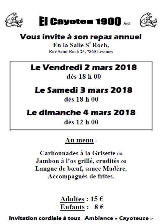C’est la semaine prochaine qu’aura lieu le souper du « EL CAYOTEU 1900 ». Tout le weekend, vous aurez le choix de goûter aux menus proposés par les organisateurs. Rappelons au passage que le « ROYAL VELO CLUB SAINT ROCH » fait partie de cette ASBL. Alors si vous participez, vous donnez immanquablement aussi pour l’organisation des courses cyclistes.