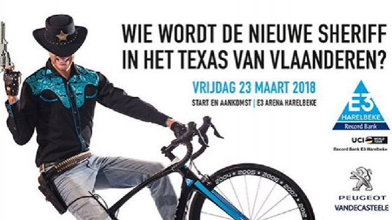Vendredi au tour du « RECORD BANK E3 HARELBEKE ». C’est maintenant devenu une habitude, on donne le nom du sponsor à la course. Espérons seulement que PANZANI ou AIRPIC ne soient pas sponsors !!! Avec le E3, on est jamais à l’abri de rien. Souvenez-vous des anciennes affiches. Et regardez celle de cette année. Le Texas en Flandres. Ouais, bon. Cela va prêter à confusion pour nos gamins !!! lol . Les teams suivants sont en lice : BMC > VANAVERMAET, DRUCKER, BORA > SAGAN, AG2R > NAESSEN Ol, ASTANA > DEVREESSE, KATUSHA > B PLANCKAERT, TREK > STRUYVEN, SPORT VL > DELTOMBE, WANTY > VANMELSEN, BACKAERT, VERANDAS WILLEMS > KRUOPIS, DEBONDT, WB > MORTIER, SIX, … . Nous serons sur le parcours à Goeferdinge, au ravito, à 13h30, afin de pouvoir regagner rapidement le domicile car cela passe en tv sur SPORZA à 15h. Photos et article sur site en soirée.