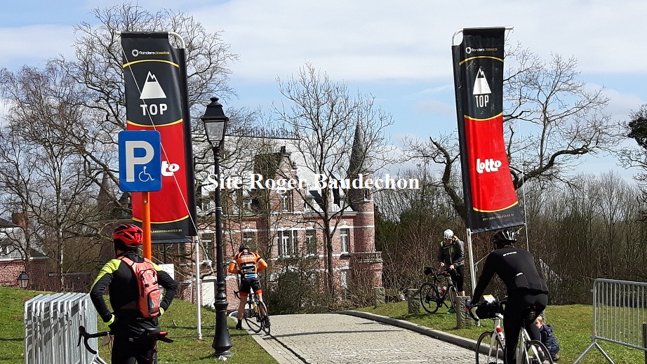 Temps parfait. Mais un vent assez fort quand on l’a de face. Direction Grammont par le Ravel pour démarrer notre périple du RONDE PELOTON. Pour vous donner une idée, passaient uniquement dans le MUUR les 229 et les 174 km. Pas les deux plus petites (si on peut dire) distances. A se demander d’où venaient toutes ces personnes tant il y avait un monde monstre sur la route. Qui plus est, pour faire de tels circuits, il faut être bien entraîné. Nous avons directement embrayé à partir du pont de la Dendre en centre ville. Premier pallier la Place de Grammont. Deux anglais nous demande de leur prendre la photo. Accord cordial. Nous les invitons à visiter le centre du tourisme en vitesse afin de voir les Manneken Pis en maillot de course. Celui de Bruxelles me demandera l’un d’eux. Pas du tout. Le plus vieux est ici à Grammont que diable. On repart. Second pallier les Vesten. Passage en face du portique du départ du RONDE DES JUNIORS. Notez que les néerlandophones ont acquis des barrières nadar first class. Plus de pieds qui débordent sur la chaussée mais ils sont un peu penchés en arrière. Puis, grimpette du MUUR. Nous y croisons Michel l’acrenois, qui comme toujours, est fidèle au poste. Allez Michel !!! Allez Arnold !!! Là, un français nous demande si nous n’avons pas de la colle. On lui répond que si c’est pour son boyau, il n’y a pas de soucis, ça tient sans. Mais en fait, c’était pour coller son tube de selle qui tournait dans le cadre. Merde alors. Puis on croise un anglais, on entame la bavette et il fini par nous dire qu’il habite à 5 bornes de là… . Ouais. Puis vient le passage le plus pentu. Il y a pas mal de terre entre les joints. La roue patine. SPORZA filme à tout va. Pas question de flancher. Arrêt sur le dessus pour quelques images avec le smartphone. Puis on arrive à l' »HEMELRIJK », le resto du haut. De la, on voit à peine de KAPEL. Il y a des cyclos partout et du monde également. Puis on passe le TOP sommet. Il y avait longtemps que nous n’avions plus pris le MUUR, cela fait du bien. Dans la descente, stop and go. Des centaines de cyclos sont agglutinés autour du ravito, du dépannage, de la croix noire et jaune (notre croix rouge), des stands à pubs, … . Un vrai village sur tout le parking. On parle anglais, espagnol, italien, flamand, … et puis, il y a des accents scandinaves et des pays de l’est. Quelle fête !!!! Nous en prenons plein les yeux. Et du matos … que du beau matos. Nous discutons avec les uns et les autres. Tous des mordus. Mais il y en a tout de même une pelletée qui a déjà la grimace et quand on voit ce qui les attend encore, pas sûr qu’il n’y en aura pas à la loupiote sur la route demain matin. lol Notre périple continue. Et ce sera pareil en haut de chaque « Berg ». Tous ont un dossard de vélo avec leur prénom sur le devant du guidon, un code barre à l’arrière et un collant avec les monts à franchir à placer sur le cadre. Dire que c’est mou, serait donner une mauvaise information. Le rythme est costaud. Dans la descente vers l’ancienne fabrique allumettière, nous roulons à plus de 60 km/h. Sur la route de Goeferdinge et Zaarlardinge à près de 42 km/h. Puis, à bout de souffle, nous ne forçons plus. Les gars vont à fond de balle vers le Valkenberg. Nous franchissons le mont la cagoule entre les dents et la buée sur les lunettes. Nous ne voyons plus rien tellement la transpiration est intense. Mais il y a autant de monde qu’à Grammont. Nous n’avons plus de guibolles. On récupère (un peu) avant d’attaquer l’Eikenberg. Nous avons même un peu froid car tout mouillé que nous sommes, le vent rentre par les trous. Puis retour maison. Nous sommes trempé de chez trempé. Mais il reste encore à faire le chemin vers La Houppe et Lessines. On vous l’avoue honnêtement, nous avons eu de la peine à arriver. C’était notre première sortie avec le vélo de route. Pas la même position, pas le même effort. Et puis du tout plat habituel à aujourd’hui sans aucun plat, ça change tout. Nous avions dit que nous y allions. C’est fait. Maintenant, il va bien falloir une semaine pour récupérer. Notez qu’à peine à la maison, ouf ouf ouf, changement de tenue et départ pour Flobecq afin de voir le déroulement du TMC. A l’heure de vous écrire, le canapé a bien fonctionné. Heureux d’avoir vu ce grand événement qui d’après ce qui se disait rassemblait plus de 16.000 rouleurs.