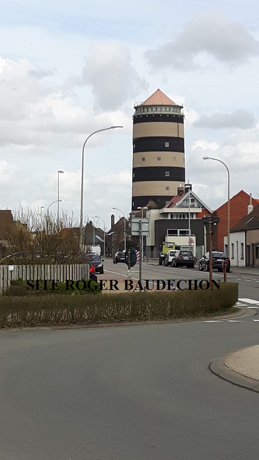 Photo. La Blauwe Toren est votre point visuel. Vous allez tourner tout autour. Il vous servira à toujours pouvoir revenir vers BREDENE. Mais elle est dans le DORP. Il sera donc nécessaire de faire deux ou trois km pour arriver AAN ZEE. Notez que la tour bleue et blanche est devenue brune et beige depuis trois ans. Ici tout est blauwe : un restaurant, une écluse, un lieu dit, … .