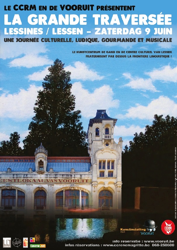 La Grande Traversée, c’est un projet du Vooruit et du CCRM qui exploite ces convergences et fait fi des divergences linguistiques. L’idée est de faire se rencontrer les publics des deux institutions dans une chaleureuse ambiance “zonder grens”. Première rencontre à domicile, Gand vient à Lessines. Le 9 juin, une ribambelle de Gantois fera le voyage pour une journée pleine d’activités culturelles, de spectacles, de visites et de succulents mets transfrontaliers. (D’après vous, où trouve-t-on la meilleure tarte à maton: à Lessines ou à Grammont ?). La palette artistique est prometteuse. Les touches breughéliennes et magrittiennes en plus. Match retour en 2019, ce seront les Lessinois qui rejoindront leurs hôtes à Gand pour la 2e partie de la Grande traversée.