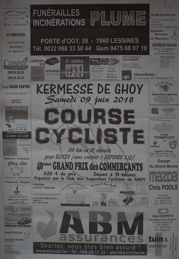 Et enfin, vers 14h15, nous serons à GHOY (affiche en entête) pour la 7eme activité cycliste de l’entité de Lessines. Une belle course pour laquelle nous espérons un maximum de rouleurs. Encourageons les organisateurs dans leur soif de vous proposer encore et toujours des courses. Cela risque de ne plus continuer !!! 15h départ du centre du village. Plusieurs articles sont déjà rédigés sur site avec des informations. Jeudi, reco avec quelques images sur Twitter. Samedi, compte rendu de la course #GHOY pour vous tenir informés. Bien entendu, photos et article sur site en soirée. Tous à GHOY ce samedi !!!