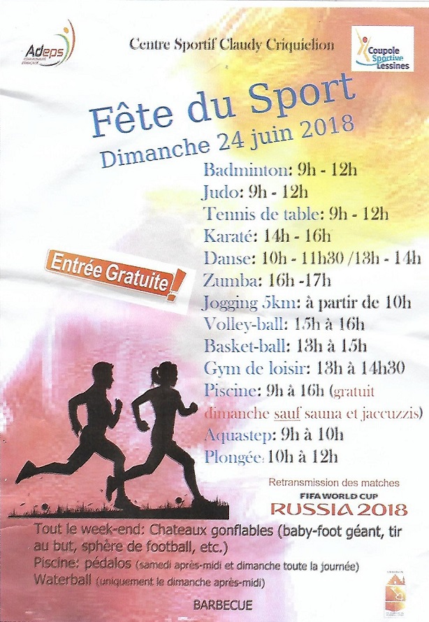 Le Centre Sportif « Claudy Criquielion » organise « LA FÊTE DU SPORT » ce dimanche 24 juin 2018. Pour rappel, c’est à côté de la piscine au Boulevard.