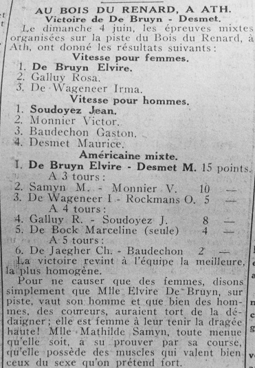 Regardons l’article concernant une compétition du 04 juin 1933 sur le vélodrome athois. Première constatation et non des moindres, c’est la participation des dames. Nous ne pouvons pourtant pas dire que c’était une époque propice à la femme. Quoique, certaines dames de la bourgeoisie s’adonnaient déjà à divers sports. Mais étaient-ils avant-gardistes pour autant ? Certainement. Il y avait des courses en équipes mixtes. C’est quelque chose que nous ne voyons absolument plus de nos jours. D’ailleurs, le journaliste ne s’y trompe pas et fait leur éloge. Tout en rappelant « au sexe qu’on prétend fort » que le muscle féminin vaut largement celui des hommes. Femme/Homme, la comparaison semblait manifestement d’actualité. Elle l’est toujours.