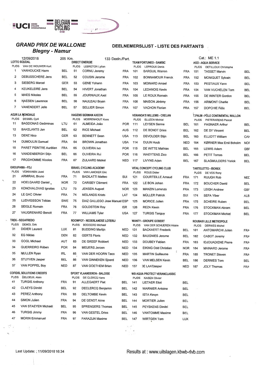 Concernant le GP de ce mercredi, la liste en dit long sur les forces en présence. Avis de dernière minute, WELLENS ne sera pas là. Il souhaite se reposer en vue du mondial. Mais en le désignant comme vainqueur potentiel, c’était faire peu de cas de coureurs comme STRUYVEN, BACKELANDTS, VANGOETHEM, EICKING, MARTIN, TURGIS ou DENZ pour ne citer qu’eux. Sur un tel parcours entre BLEGNY et NAMUR, il y aura des lâchés en abondance. Cette course est aussi une belle opportunité pour des coursiers comme ceux de TPALM, TARTELETTO ou AGO AQUASERVICE  de se montrer. Même si ce ne sera pas évident. Faire l’objet d’une échappée serait déjà une bonne chose. Il faudra de bonnes jambes pour pratiquer les + de 200 km.