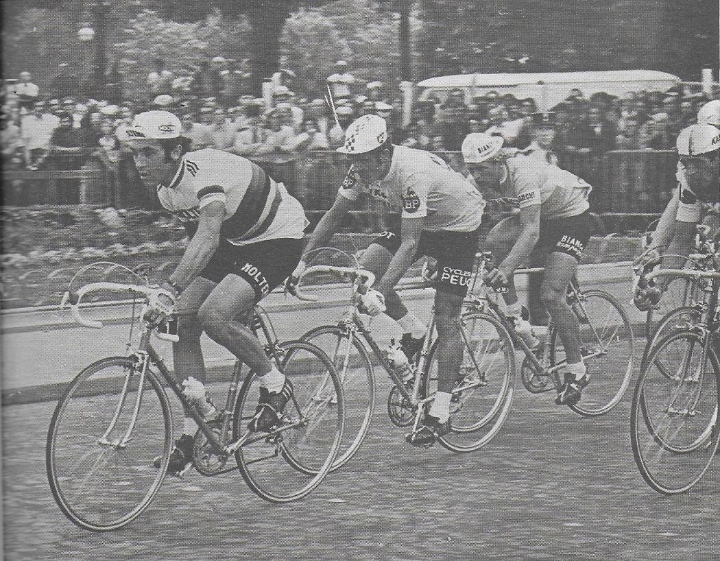 Ce serait faire injure aux connaisseurs que vous êtes de vous demander si vous vous souvenez de Bernard THEVENET !!! Et pourtant, nous restons convaincus que les plus jeunes n’ont aucune idée du coureur qu’il était. C’est tout de même le « tombeur » de MERCKX sur le Tour de France 1975. Diminué, MERCKX avait été frappé au foie par un spectateur dans l’étape du Puy de Dôme. A 71 ans, le coureur originaire de Saint-Julien-de-Civry, né dans une ferme, au lieu dit « Le Guidon » (cela ne s’invente pas) a été professionnel de 1970 à 1981. Ses équipes : « PEUGEOT », « TEKA » et « PUCH ». Très fidèle à la première, il y sera resté dix années. Ses équipiers : BRACKE, DANGUILLAUME, PINGEON, SCHOETERS, VANCONINGSLOO, DELISLE, ESCLASSAN, GODEFROOT, OVION, SIBILLE, BOULOUX, ROUXEL, TSCHAN, les MEUNIER, VANDENBROECKE, BRAUN, DELEPEINE, HEZARD, LAURENT, TALBOURDET, DUCLOS LASALLE, ROSIERS, BOSSIS, DECAUWER, KUIPER, GUITERREZ, DEJONCKHEERE, LEJARETTA, MARTINEZ, LOPEZ, THALER, ARNAUD, CHASSANG, … . Il est assez réducteur de ne citer que quelques victoires. THEVENET, n’a pas roulé que des tours. Il avait néanmoins une prédilection pour celui organisé dans son pays. (11 participations) Il roulait aussi des six jours. Son palmarès fait état de 108 victoires. Parmi lesquelles beaucoup de critériums (47) et : 2 Tours de France, le Tour de Romandie, 28 étapes sur différents tours, le Tour de Catalogne, le Dauphiné Libéré, le Tour du Haut Var, … mais aussi le championnat de France sur route, 6e à Liège Bastogne Liège, 3e à Paris Camembert, 1er des six jours de Grenoble, … .