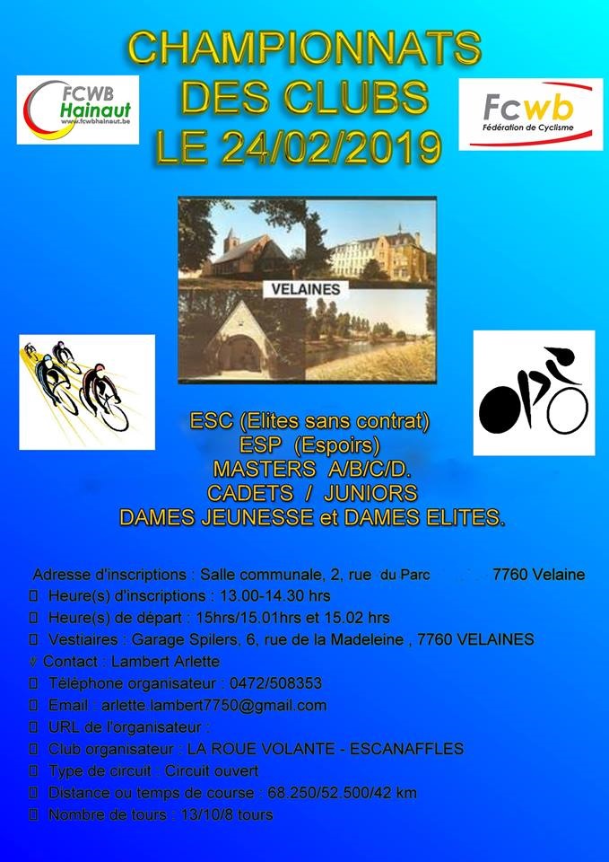 Dimanche, le 24 février 2019, c’est à Velaines (entre Frasnes-lez-Anvaing et Tournai) qu’auront lieu les Championnats des clubs FCWB. « LA ROUE VOLANTE ESCANAFFLES » risque bien d’attirer un monde considérable dans cette petite commune campagnarde. La veille, c’est à Ramillies qu’auront lieu les championnats des clubs pour Namur-Luxembourg-Brabant Wallon.