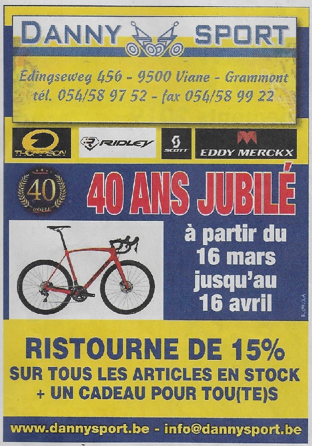 Cette fois, c’est « DANNY SPORT » (Viane) qui fête ses 40 ans d’ouverture. Avant d’établir son commerce en face de l’église du village, Danny DEPELSENEER a été coureur cycliste. Un bon. Par ailleurs, il faut rappeler qu’il est sponsor des « CYCLOS DE SAINT-ROCH » (Lessines) depuis plusieurs années. Service vente et surtout service après-vente top !!!