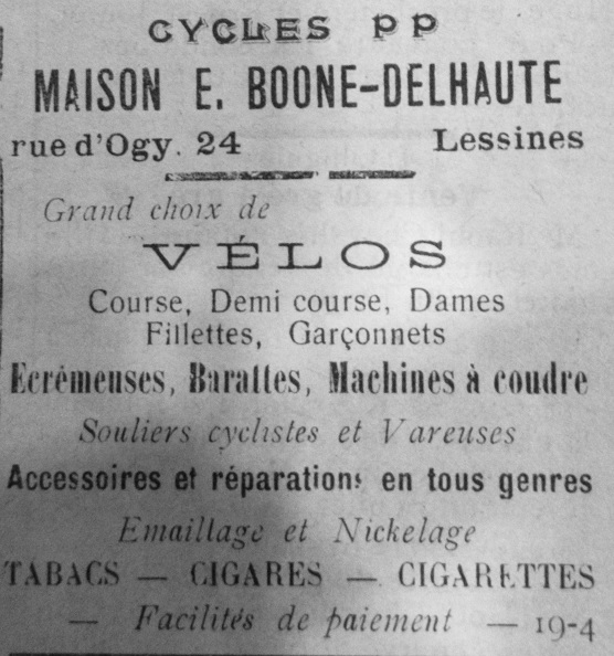 Le cycliste (quasiment) professionnel qu’était BOONE Emile, alias « Mimile » ou encore « Milo » n’avait pas des moyens démesurés pour assouvir sa passion. Plusieurs articles nous démontrent qu’il a roulé de grandes courses. Il s’est très bien classé à certaines occasions. Et il a remporté de nombreuses petites épreuves, en ce y compris, chez les « tous coureurs ». Il a d’ailleurs une longévité sportive de près de vingt années. Emile BOONE tenait un magasin de cycles à la (rue) Porte d’Ogy à Lessines. Tout comme LONGEVAL, (à Acren) ou BOUCHER. (à Lessines) En réalité, les textes nous apprennent que c’était son épouse, dame DELHAUTE, qui assurait cette tâche. Profitant ainsi de la notoriété de son mari. Nous ne sommes pas encore parvenus à retrouver l’emplacement du magasin.