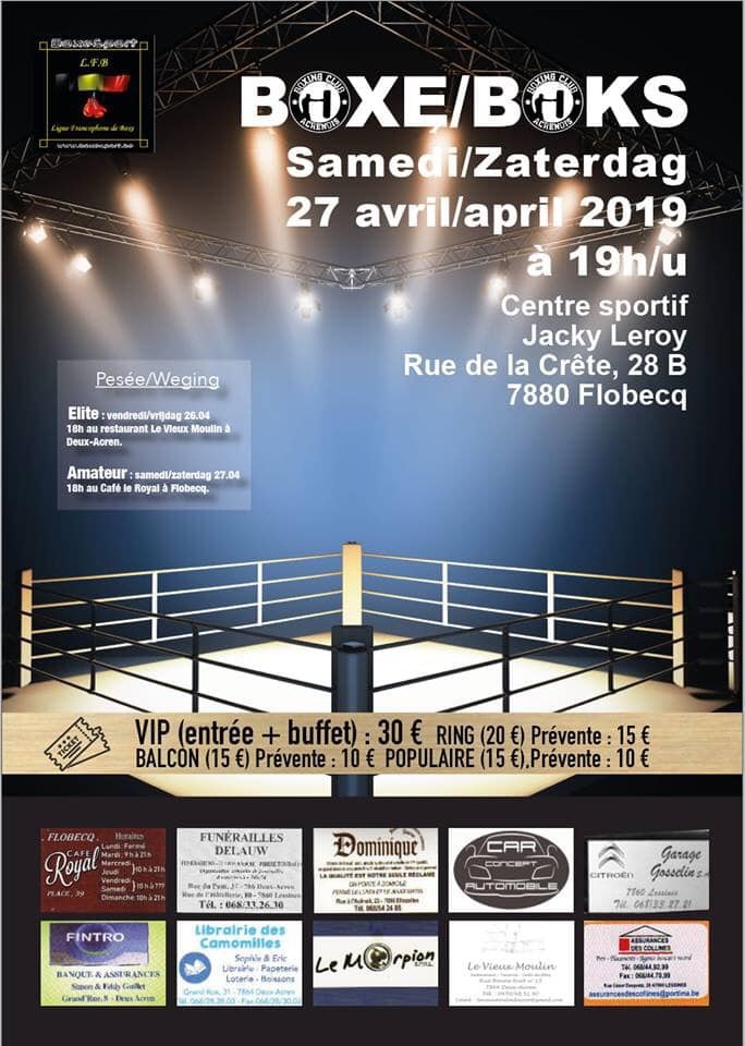 Le « BOXING CLUB ACRENOIS » cher à Alain BAUDECHON, (cousin, ancien pro en poids légers) organise son gala de boxe, ce 27/04/2019, à Flobecq.