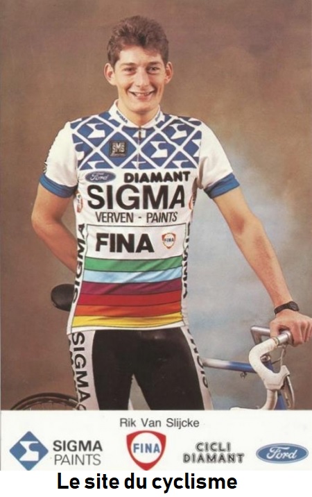 Qui ne connait pas Rik VAN SLYCKE ? Il s’agit d’un coureur d’une génération relativement proche. Âgé de 56 ans, ce gantois de souche a été professionnel durant 13 années au sein des équipes suivantes : « TVBLAD – EDDY MERCKX », « SIGMA – FINA », « HISTOR – SIGMA », « LOTTO » et ses variantes, « COLLSTROP », « RDM » et ses variantes et enfin « SPAR – RDM ». Il a eu comme équipiers : HEIRWEG, VAN CAMP, WIJNANT, GIESBERTS, HEYNDERICKX, MALFAIT, CECI, DALGAL, DEWILDE, HAGHEDOOREN, ILLEGEMS, KUIPER, MESSELIS, NEVENS, PEETERS, SEYNAEVE M et S, TOURNE, VANHAERENS, HOLM, CLARK, FRISON, MOREAU, PILLON, ROCHE, VERSTREPEN, BAGUET, DECLERCQ, DUBOIS, HENNEBERT, HERINNE, MOREELS, MUSEEUW, REDANT, VANDENABEELE, WAUTERS, BAGUET, les DECLERCQ, FARAZIJN, ROOSEN, VAN DE LAAR, VAN PETEGEM, EECKHOUT, LAPAGE, PEERS, STREEL, THYS, VAN DER POEL, VAN ITTERBEEK, GILMORE, TKATCHENKO, ROMPELBERG, les OMLOOP, CORNELISSE, … . Au niveau des résultats il compte 17 victoires dont : 1er HANNUT, 1er GP DU PRINTEMPS, 1er à GULLEGEM, … . Il a des accessits à AARTRIJKE, OSTENDE, … . C’est un coureur que vous avez certainement beaucoup vu sur le Tour de France. Il a aussi des titres de champion de Belgique sur piste en amateur international et chez les militaires.