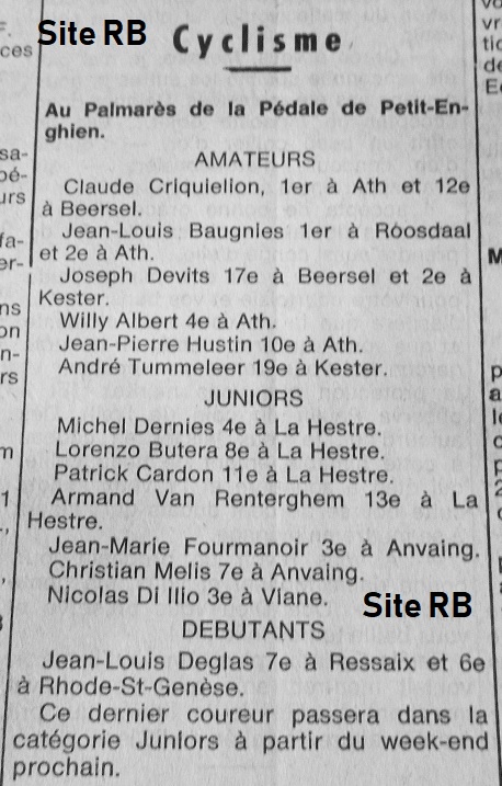 Nous allons laisser rêver les anciens !!! En 1978 et après, le club de « LA PÉDALE PETIT-ENGHIEN » a eu un effectif pléthorique. Ils étaient nombreux à avoir de grandes capacités. Regardez plutôt. CRIQUIELION (pro), BAUGNIES (pro et père de Jérôme, le pro de WANTY GOBERT), DEVIDTS (pro), ALBERT (pro), JP HUSTIN (un bon), TUMMELEER A (un bon) et puis chez les juniors : M DERNIES (pro), BUTERA, CARDON, VAN RENTERGHEM, FOURMANOIR, MELIS, DI ILIO. Pour terminer, en débutants : JL DEGLAS. Il nous manque Jean-Claude ANCIAU et par la suite, Eric FRANCHE, Pascal PIETERAERENS, Pascal PLAITIN, les LONGEVAL, Francis SERLIPPENS, Daniel VILAIN, Roger CROHIN, Michel PICOUX, Bertrand RASSEMONT, Christian JOURQUIN, Georges et Marc BOUILLON, … . Il nous est impossible de tous les citer car c’était vraiment un très grand club. Un jour, nous publierons une liste complète de nos régionaux. (temps)