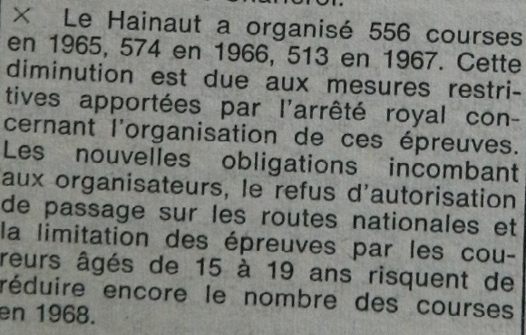 Cet article du journal « Le Postillon » de 1968 est intéressant et édifiant à plusieurs égards. Vers 1965, les compétions commencent à diminuer et avec elles le nombre de coureurs. Les normes changent. Aujourd’hui encore, réglementation, sécurité, diversité, … influent sur notre sport préféré.