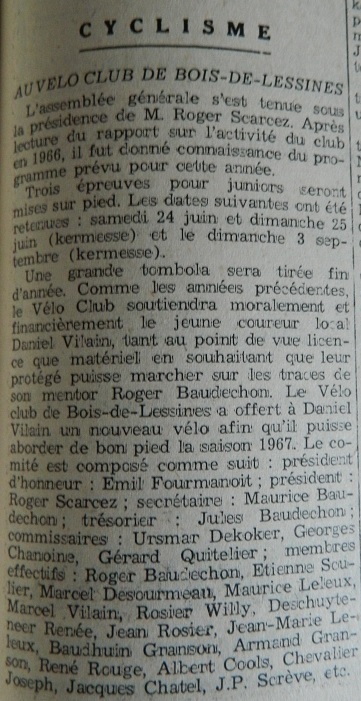 Le « vélo club » a soutenu bon nombre de coureurs comme : Roger BAUDECHON, Roger CROHIN, SCULIER, BODSON, PICOUX, … et Daniel VILAIN. Que nous remercions grandement au passage pour la transmission de ses images via Nadine. (sœur) Daniel est le fils de Marcel, un supporter qui suivait le paternel presque partout. Un acharné de cyclisme. Un vrai de vrai. Daniel a fait quelques belles saisons. Il a principalement roulé chez les débutants et les juniors. Un grand gabarit. Il y a toujours eu des coursiers dans la localité. Ce n’est plus le cas à l’heure actuelle.