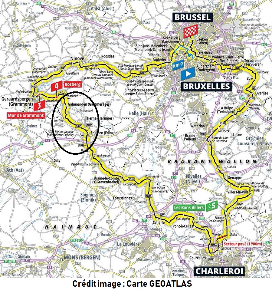 La traversée de GALMAARDEN sera certainement un moment chaud car la Place de la localité est petite et coupée en deux. Le peloton va être canalisé sur une bande de 4 mètres. Par ailleurs, ce village est très cycliste. Il va y avoir un monde fou.