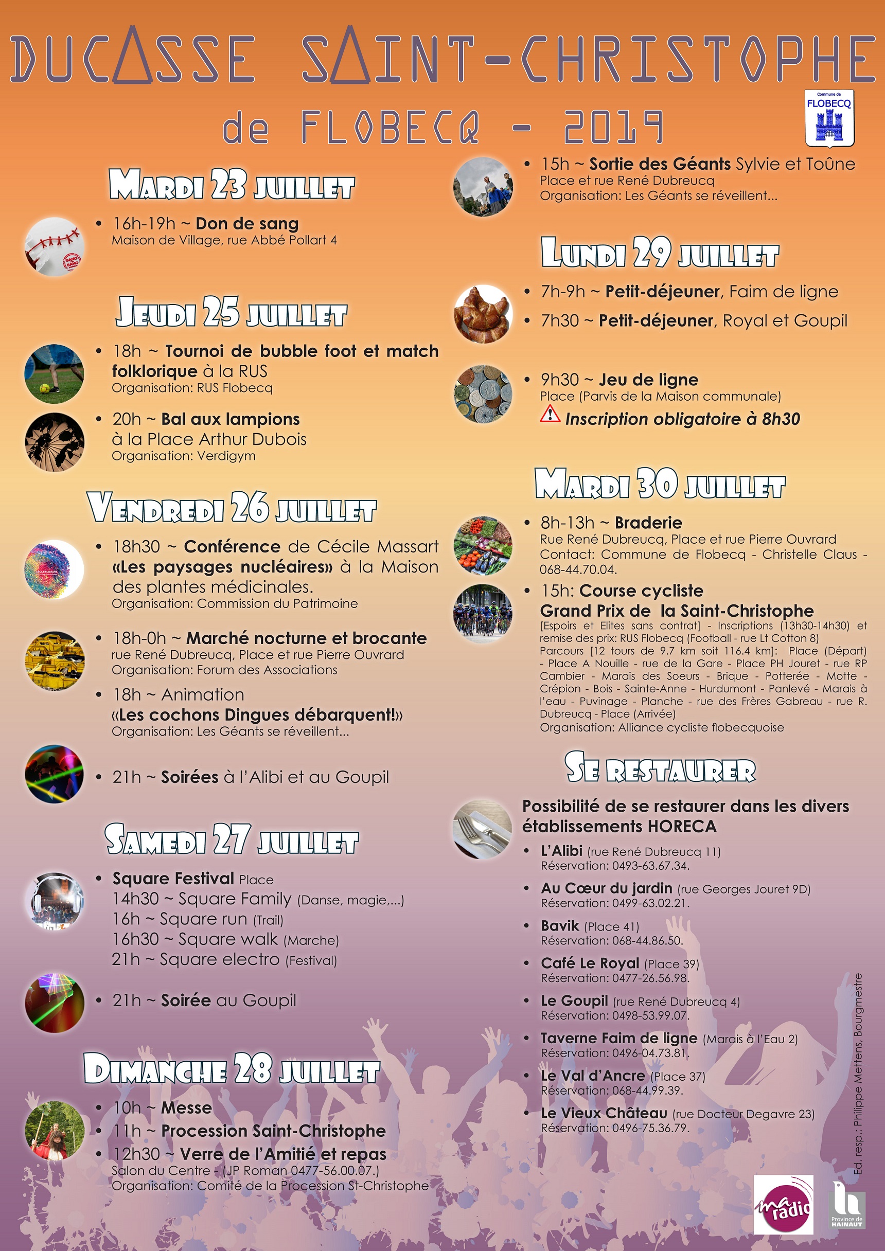 « L’ALLIANCE CYCLISTE FLOBECQUOISE » organisera le « GP DE LA SAINT-CHRISTOPHE », le mardi 30 JUILLET 2019. Cette épreuve est réservée aux élites sc et aux espoirs. Le départ est donné à 15H00 de la Place de la localité. Chaque année, les coureurs sont nombreux à y retirer le dossard. Circuit exigeant. Il est réservé à des grimpeurs ou du moins, à des durs au mal. Max PICOUX sera le régional de l’étape. Sa famille habite à Flobecq.