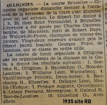 Le lendemain de « BRUXELLES-OLLIGNIES », une compétition pour « non licenciés » a vu la victoire de l’ollignois SOETENS devant notre grand-père Gaston BAUDECHON. Fernand LELEUX de Mévergnies termine 8e.