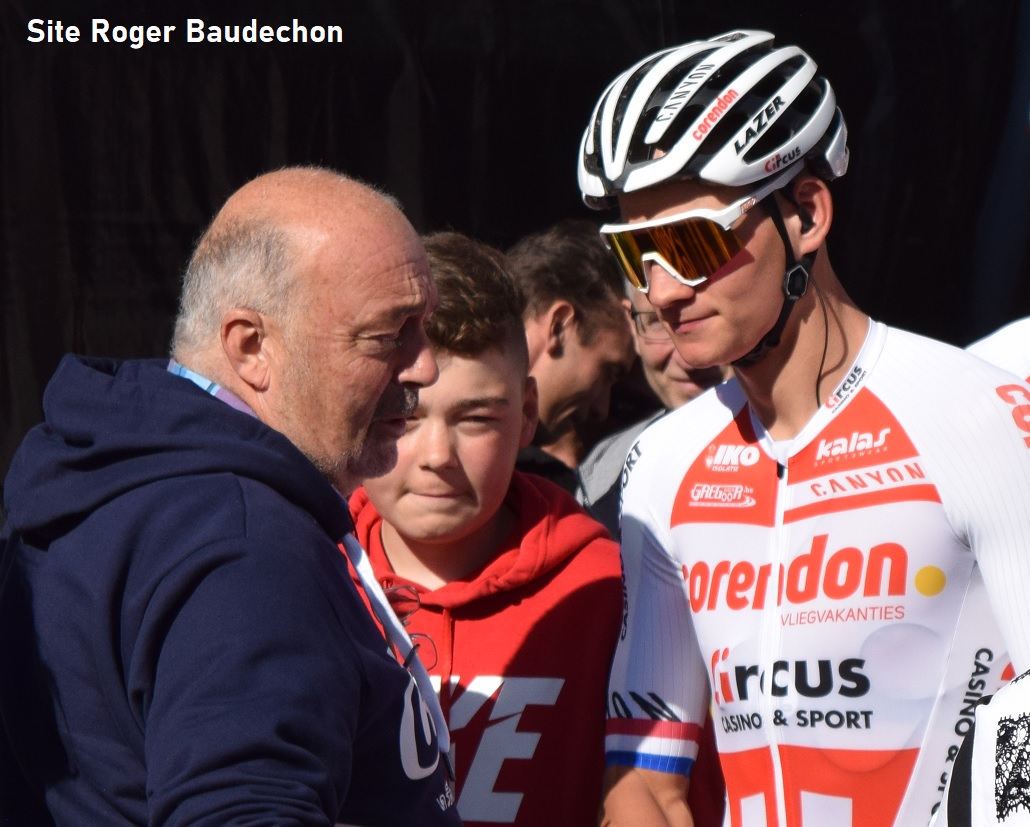 Photo. Voici que Mathieu VAN DER POEL se rappelle au bon souvenir de la planète cyclocross. Il est ici avec un ancien coureur bois-de-lessinois : JJ LEROY et le gamin dont il s’occupe chez les débutants.