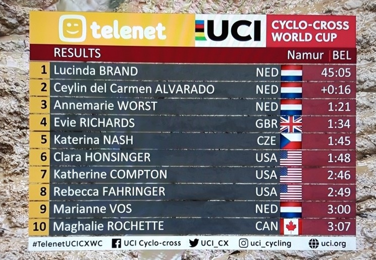 Les courses furent grandioses. Mathieu VAN DER POEL est encore là. Une vraie force de la nature. Pourtant, le plus méritant du jour fut sans nul doute Toon AERTS qui ne s’est jamais avoué vaincu. Sans oublier Corne VAN KESSEL qui remonte PIDCOCK pour terminer 3e. Chez les dames, Lucinda BRAND se plait dans le namurois, elle l’emporte une nouvelle fois dans la capitale wallonne. Les hollandaises, absentes hier à Sint-Niklaas, trustent le podium avec DEL CARMEN et WORST. Et puis, les anglaises et les américaines montrent qu’elles se familiarisent rapidement avec ce genre de discipline. Un véritable plébiscite pour le cyclocross !!!
