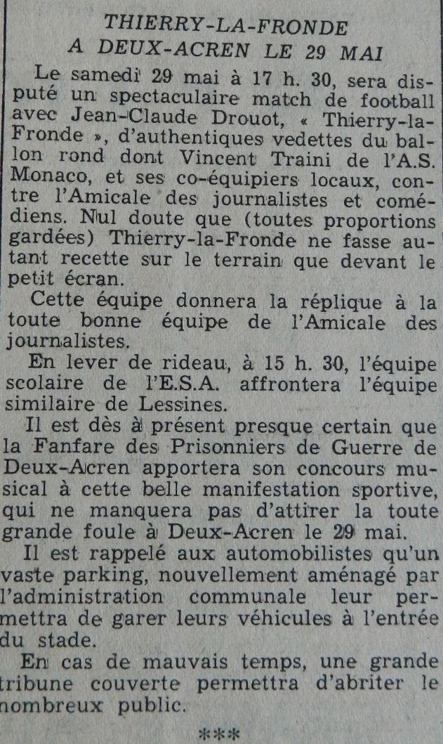 Le 29 mais 1965, l’ENTENTE SPORTIVE ACRENOISE (foot) a créé l’événement en proposant un match entre d’une part, des footballeurs et d’autre part, des journalistes + des comédiens. Jean-Claude DROUOT y était attendu en vedette internationale. Pardon, « Thierry la Fronde » … . Un autre match opposait des scolaires. Par ailleurs, vous remarquerez que la « FANFARE DES PRISONNIERS DE GUERRE DE DEUX-ACREN », une des plus anciennes de notre entité, apportait déjà son concours aux événements locaux. « Vaste parking et grande tribune » sont à disposition en cas de mauvais temps. Vous n’avez aucune excuse de ne pas y être. 😉 Et vous qui nous lisez, avez-vous assisté à ce match ?