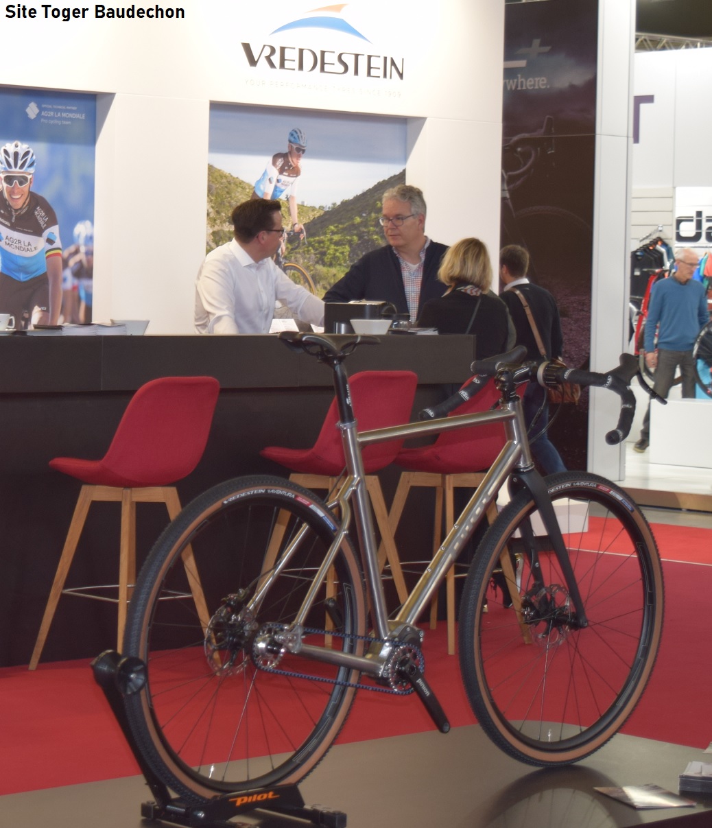 Photo. Un « GRAVEL » ? Chez « VREDESTEIN », un vélo pose dans le stand de « Velofollies ».