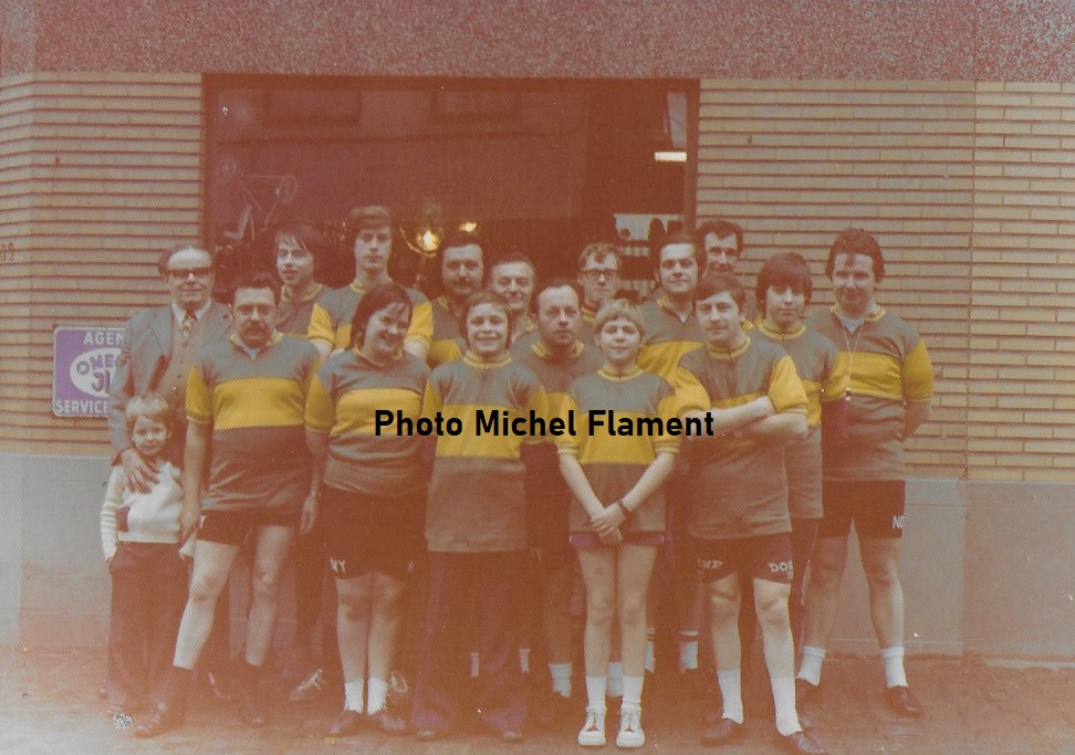 Photo. C’est devant le commerce des cycles « NERY BULTIAU » que « LA PÉDALE ACRENOISE » pose pour la photo. Vous pouvez reconnaître le propriétaire en « civil » et puis : Willy VANNIEUWENHOVE, son fils, Thierry LONGEVAL (anc coureur), Joel FLAMME, LEYBAERT (anc coureur), … et Michel FLAMENT. (à droite) La photo appartient à Mr FLAMENT. Interdite de reproduction.