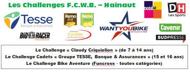 1. Tout d’abord, le « CHALLENGE CLAUDY CRIQUIELION » (pour les 7 à 14 ans). Une initiative de la « FCWB HAINAUT ». Il est ouvert à tous. Pas uniquement aux coureurs de la « FCWB ». Un challenge de régularité qui ne vise que la route. Attention à la réglementation !!! Pour marquer des points, il faut rester dans les clous. TOUTES les courses organisées en Hainaut, sauf les championnats, entrent en ligne de compte. Exemples : Chaque coureur marque des points dans sa catégorie. Pour être classé dans le général, il faut 75% de présences. Si un CLM chevauche avec une épreuve en ligne, seule la seconde sera portée en compte. Des prix seront attribués aux lauréats en fin de saison. Le Règlement complet a été approuvé par le comité directeur ce 15 février. Il est disponible sur le site de la « FCWB HAINAUT ». Nous retrouvons l’épreuve du « RVC SAINT-ROCH DE LESSINES » (Aspirants à Houraing) dans ce challenge.