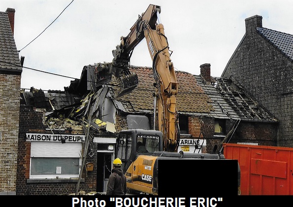 Photo. Merci à la « BOUCHERIE ERIC » pour cette image du début des travaux. Un premier coup de pelle (grue) a entamé le toit. C’était dans la matinée du 08/02/2020. Article 2.