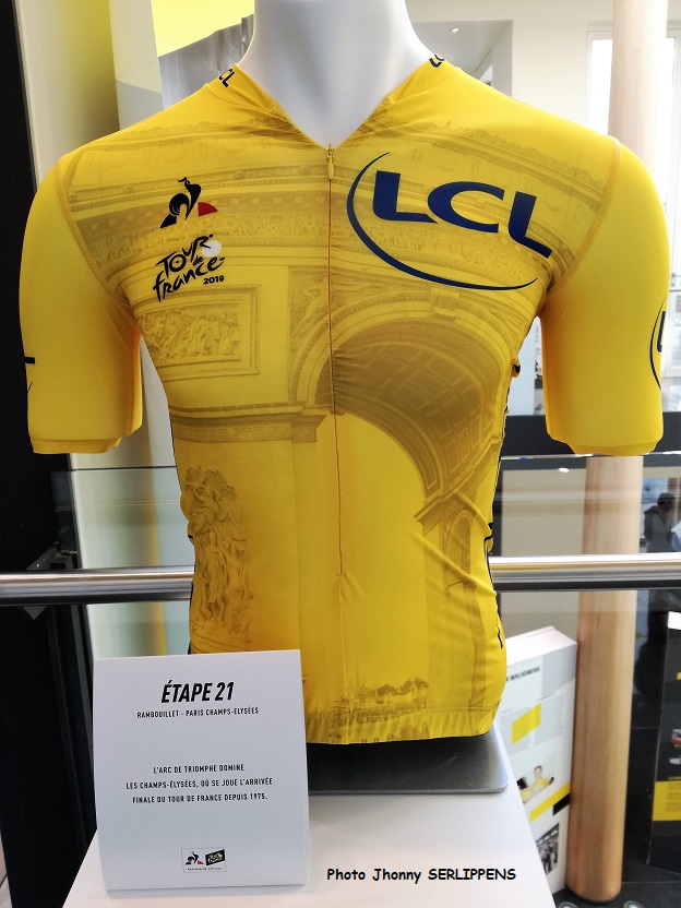 Photo. Un maillot qui était exposé dans « L’ESPACE WALLONIE-BRUXELLES ». Celui qui a été décerné au vainqueur après la dernière étape parisienne. A chaque étape, un motif différent.