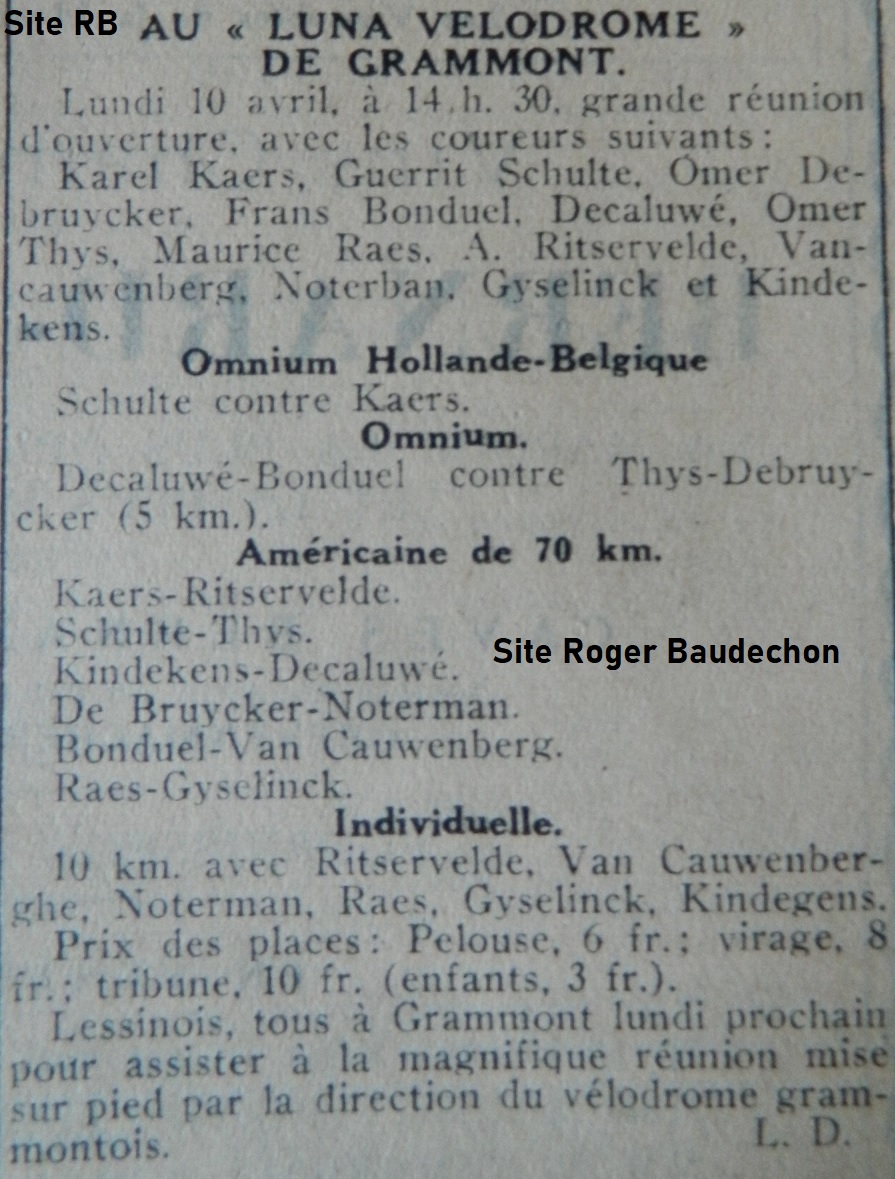 Le « LUNA », nous aimons son histoire. Elle vous a été racontée dans un post précédent. (2017-2018) En bref. Un promoteur immobilier lessinois veut le faire construire dans sa propre ville. Il ne parvient pas à trouver les fonds nécessaires et se heurte aux autorisations incertaines. Par contre, la Ville de Grammont est intéressée. Le vélodrome sera construit chez nos voisins néerlandophones. Avant 1939. Déjà une belle histoire belge. Il n’y a pas eu que celle-là. Nous reviendrons sur d’autres « bizarreries » un peu plus tard. Le 10 avril, une grande course mettra en présence Karel KAERS (Anvers), l’ancien champion du monde de LEIPZIG.(All) Frans BONDUEL (Termonde) et Edgard DE CALUWE (Ninove-Grammont), des « sterke renners ». Et notre Omer THYS, enfant de Lessines. Au niveau de l’omnium, ce sera un match BELGIQUE-HOLLANDE. KAERS est la figure de l’avant-guerre. Il casse la baraque. Qui d’autre que lui pourrait vaincre Guerrit SCHULTE ? (Amsterdam) THYS est partant pour l’omnium suivant. A l’américaine, la totalité des protagonistes se retrouvent sur 70 km. Le prix des places d’entrée laisse rêveur. Nous savons par d’autres écrits que le « LUNA » attirait souvent la grande foule. Au niveau de l’annonce, c’est vraiment quelque chose. « Lessinois, tous à Grammont … ». Quand vous pensez que ce vélodrome pouvait être construit à Lessines … cela devait bien faire rire les grammontois. Mais « Le Petit Omer » (surnom) THYS était présent pour mettre en valeur ses qualités athlétiques.