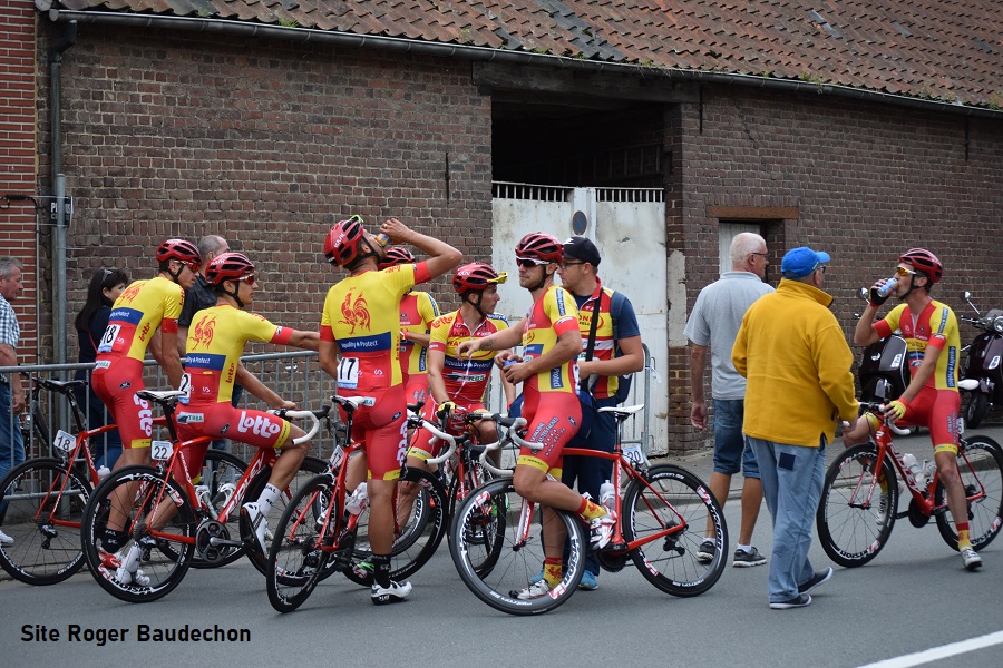 Nous l’avons retrouvée !!! Après chaque (moyenne ou grande course) les coursiers ont tendance à se rassembler autour des soigneurs pour avoir des boissons ou des habits pour se couvrir. Et puis, c’est le moment d’un tout petit débriefing. De connaître la place des uns et des autres ou de la condition du jour. Sur ce cliché pris à Viane, les « WB » sont « RESTES GROUPIR ». Après, ils se sont orientés vers le mini bus qui était positionné à côté des « Cycles Dany ». Une belle épreuve.