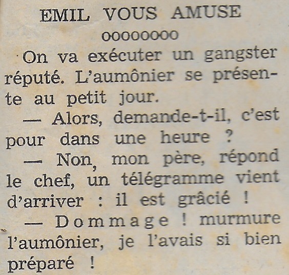 Dans les années 1970. « CHEZ EMIL », un magasin de vêtements du centre ville lessinois insérait souvent une grande publicité dans le journal de Robert GOESSENS. « L’HEBDO » était tiré à +/- 14.000 exemplaires chaque semaine. Dans la publicité de « CHEZ EMIL » (« Emil Domine » ou « Emil à Capieau ») Il y avait toujours une blague du style à celles que vous pouvez retrouver dans un almanach. Il y a même des citoyens qui ne lisait QUE : « EMIL VOUS AMUSE » avant de s’en débarrasser. Une autre époque.