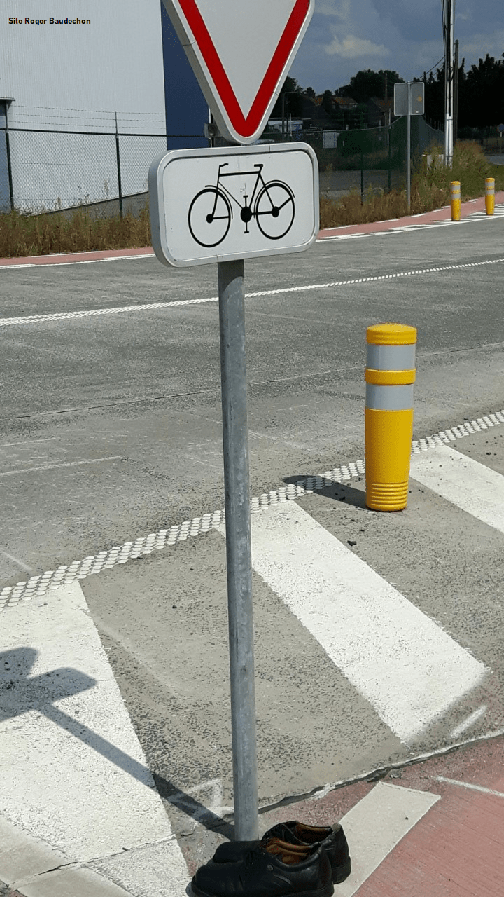 C’est à croire que les bulles pour la récolte des vêtements/chaussures sont remplies. Autant à Bassilly, il y avait une chaussure accrochée à un panneau « point-nœud » autant à Lessines, une paire était bien rangée devant un « céder le passage ». Si le gars a continué sur les chaussettes … bonjour la plante des pieds. Notez que nous n’avons pas regardé dans le fossé pour voir si le propriétaire ne s’y trouvait pas !!! 😉
