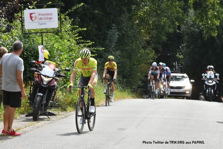 Alors que le soleil luisait à Lessines, la pluie tombait dans le grand Tournai. Même à la côte, c’était le déluge. Entre Soignies et Templeuve, les coursiers sont passés par la région du centre, Thuin et une partie du « Pays des Collines » dont la côte des « PAPINS ». Ils ont franchi le Mont Saint-Aubert avant de rendre une dernière visite aux templeuvois. L’étape n’était pas trop ardue. C’est ainsi qu’une longue échappée s’est dessinée avec PAQUOT T, DUVAL J, REYNDERS J, PLANCKAERT ED et VANDENBRANDE J. Malgré un gros forcing, ils ont été repris. C’est un peloton assez consistant qui s’est présenté pour l’emballage final. Arnaud DEMARE lance le sprint. Sam BENNETT prend l’ascendant. Toutefois, il se fait remonter par l’australien Caleb EWAN. Tim MERLIER, complète le podium du jour.