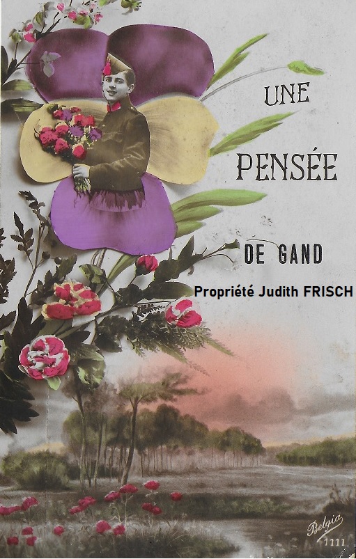 Carte de « fantaisie », production « BELGIA ». Elle a été envoyée par « Georges » à « Angèle ». Deux amoureux de la Rue d’en Haut à Deux-Acren. C’était en novembre 1923. Cachets et timbre faisant foi. Il n’y a pas de texte. La photo parle d’elle-même, « Georges » lui transmet « Une pensée de Gand » avec un grand bouquet de roses rouges. Vous imaginez ce que cela a de romantique alors que la guerre de 14-18 venait de se terminer et que les jeunes appelés étaient encore mobilisés ? Ces cartes nous sont personnelles. Reproduction interdite. Elles ne sont ni à vendre, ni à donner.