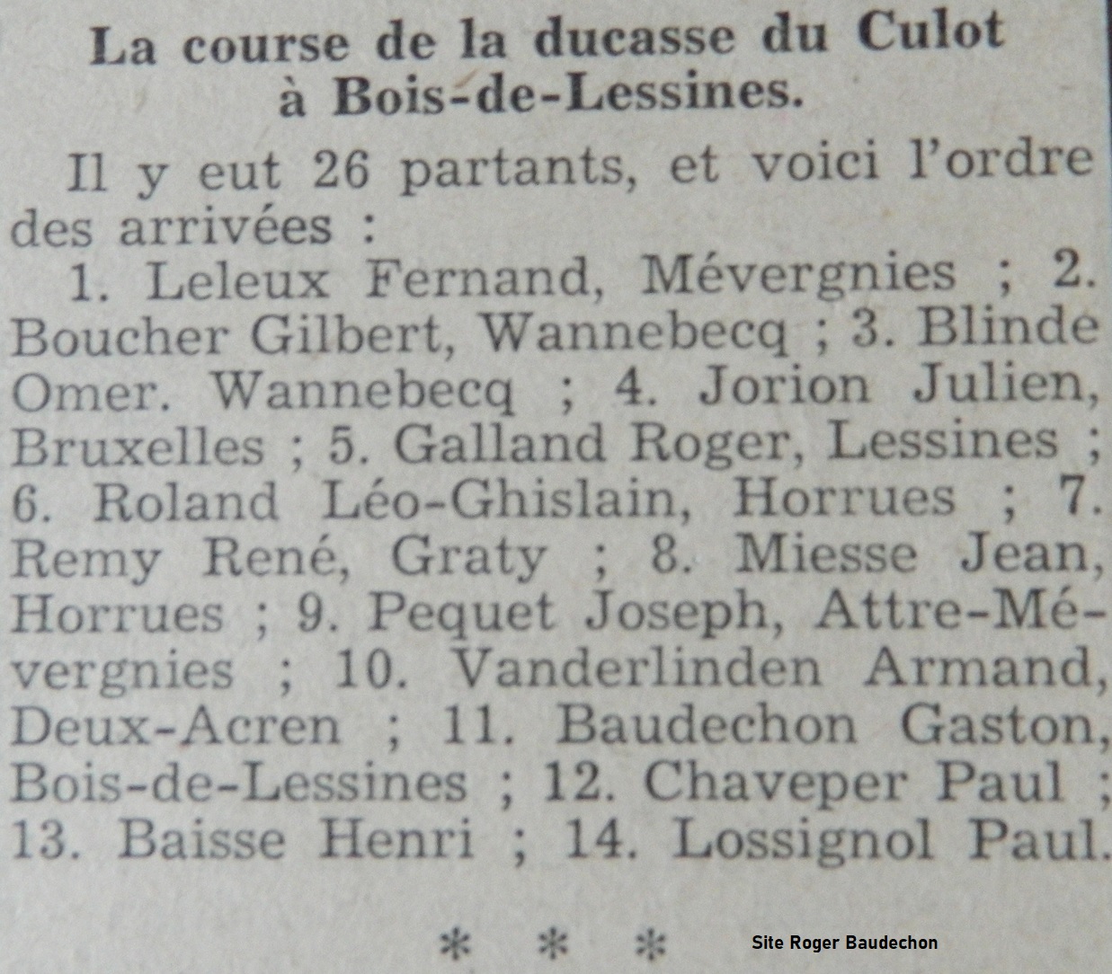Cet article fait état de la « DUCASSE DU CULOT ». Il s’agit d’un hameau situé dans le centre du village de Bois-de-Lessines. En patois, « CULOT » signifie +/- « au coin du feu ». Un peu comme à « SCRINNE » qui signifie +/- « passer la soirée entre amis ». Cela nous éloigne du sujet principal. Fernand LELEUX était un grand coursier dans les années 1940. Et même dans la décennie précédente. Ils étaient plusieurs LELEUX. C’est sa famille qui tenait le VÉLODROME de Mévergnies pour lequel nous avons rédigé plusieurs posts. Quelques photos et classements avaient été présentés lors de l’EXPO18 (Lessines). A Bois-de-Lessines, comme dans les autres villages qui feront ensuite partie de l’entité à la fusion des communes, chaque quartier avait une ou des courses. Souvent pour non-licenciés. Nous ne pourrions pas vous dire avec exactitude combien il y en avait à Lessines/Ville tant elles étaient nombreuses. Dans ce classement, Fernand LELEUX l’emporte. Gilbert BOUCHER (Wannebecq) est second. C’était le frère de Victor, lui-même grand camarade de Omer THYS. Un autre wannebecquois, Omer BLINDE, prend la dernière place du podium. Roger GALLAND, lessinois puis bois-de-lessinois, fait 5e. Pourtant, c’était un sacrément costaud. Léo ROLAND est 6e. Il a tenu un magasin de cycles sur la place de Brugelette par la suite. L’acrenois Armand VANDERLINDEN est 10e. Notre grand-père, Gaston BAUDECHON, est 12e. Son frère Jules n’était probablement pas présent. Il était souvent en bagarre avec LELEUX sur les vélodromes. Sur les 26 partants, Paul LOSSIGNOL, de la dynastie des « LOSSIGNOL », termine 14e. Cette famille lessinoise a engendré énormément de très bons coureurs. De nombreux articles de ce genre sont sur site. A voir ou à revoir.