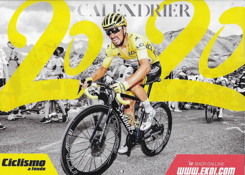 En début d’année (« VELOFOLLIES ») la marque de vêtements et accessoires distribuait des gadgets et des calendriers. Hier, quand Julian ALAPHILIPPE a remporté de main de maître l’étape 2 devant un nom moins fabuleux Marc HIRSCHI, nous nous sommes souvenu de cette pièce de collection. « EKOI » avait eu le nez creux. Imaginez. Sur la première page ALAPHILIPPE est en jaune avec la mention « 2020 ». De la prémonition. Une superbe présentation qui était sortie 10 mois avant l’heure. Notez qu’il semble que ALAPHILIPPE était sponsorisé (2019) par cette firme, pour les lunettes.