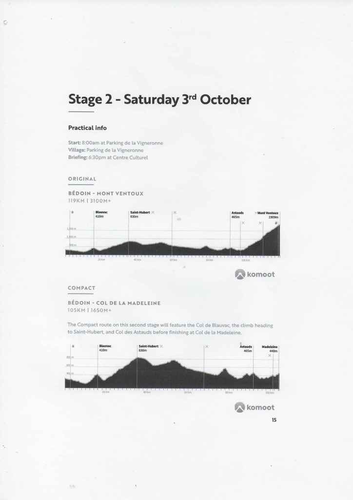 Pour cette seconde étape, il est à espérer que la nuit fut bonne. Que les muscles aient récupéré des conditions apocalyptiques de la veille. Ce samedi, le parcours semble un rien moins corsé mais dans un coin comme celui-là, vous avez rarement plus de 2 km de plat. Météo France annonce un temps … d’hiver : brouillard, pluie, soleil mais surtout des t° qui vont descendre jusqu’à 0°-2°. Ce ne sera plus totalement le grand suuuud. Voici l’étape :