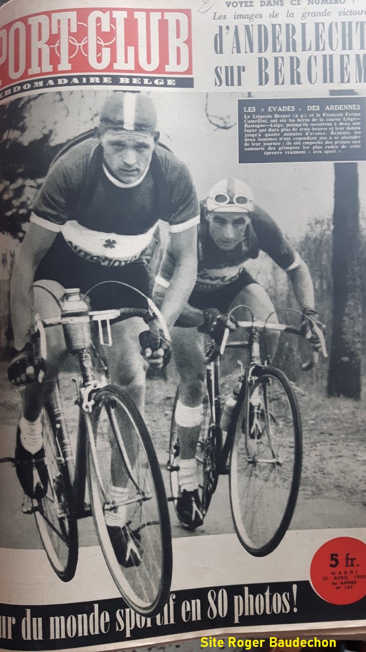 Actuellement, nous avons beaucoup revisité 1950 et 1973. Mais ce ne sont pas les caisses de documentation qui manquent. Seulement le temps pour tout ressortir des entrepôts.(greniers) Ainsi, « SPORT CLUB » est pour nous, un des plus beaux magazines. Il ne contient pas que du cyclisme. Dans l’entête, il nous remémore que le liégeois Jean BREUER avait dynamité « LIEGE-BASTOGNE-LIEGE » pour se mettre en évidence. Mais pas uniquement. Ce coureur a très bien marché sur « LA FLECHE » et sur d’autres épreuves d’avant 1950. En 1945, il gagne « LIEGE-MARCHE-LIEGE ». En 1947, il termine le « TOUR DE FRANCE » (45e) et en 1948 (ab), le « TOUR D’ESPAGNE ». Nous avons toujours maintenu que le cyclisme devait se fonder sur son passé. SES BASES. Nous avons un bel exemple de coureur qui en voulait, qui mouillait le maillot. La presse n’hésitait pas à le mettre en évidence. Alors, c’est bon (très) quelques fois de remémorer aux plus jeunes que d’autres ont foulé les routes avant eux. Des noms sont parfois oubliés. Il ne reste qu’aux mordus dans notre genre – perfectibles quelques fois, il est vrai – de les remettre, un jour ou l’autre, sous les projecteurs. Mr BREUER, un ancien champion liégeois.
