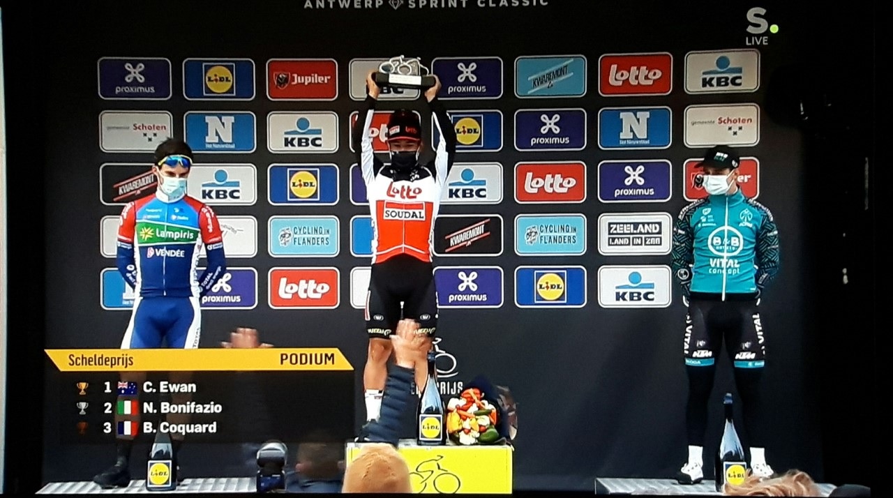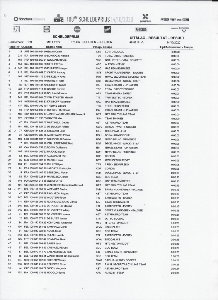 C’était prévu. Un sprint final a été le résultat d’un « GP DE L’ESCAUT » de qualité moyenne. Une course de kermesse est probablement plus emballante. EWAN l’emporte et ACKERMANN est déclassé. COQUARD prend le relais sur le podium. Le régional de notre « WAPI », Jonas CASTRIQUE fait une bonne 73e place. BACKAERT, le brakelois est 82e. HAVIK, le fonceur est 99e. Nous ne pouvons pas dire que la course fut dure. Ils sont 158 à terminer. Il y a juste une dizaine d’abandons. Nous avons connu plus dynamique. Le « RONDE » arrive, ceci explique peut-être cela … .